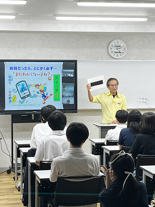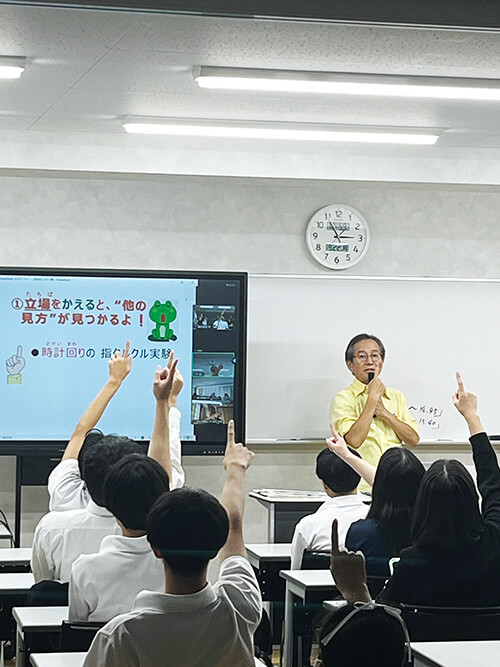 「被害者が加害者になってしまう怖さ」や「立場が変われば事象の見え方も、こんな風に変わる」など、時に下村教授ならではのパフォーマンスも交えた授業を展開。対面での1年生とオンラインでの3年生を中心にした約90人の生徒の皆さんは、今、そしてこれからの「ライフデザイン」に関わる必須な内容として前に乗り出すようにして聞いてメモなどをしていました。